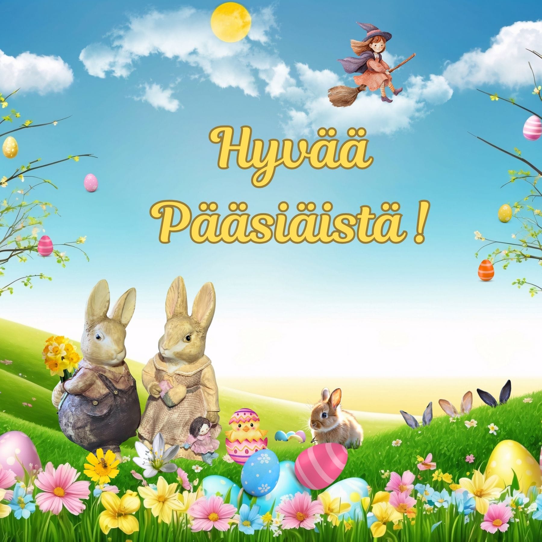 Pääsiäinen on pupujen ja tipujen aikaa. Noitien taikaa. Pajunkissoja, aurinkoa, kevätkukkien väri-iloa.